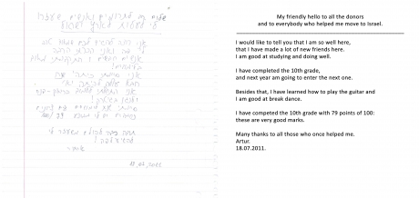 Leaving, Artur gave us a stirring letter: “Dear Phil, My name is Artur Godes. I want to thank you and the employees of the Charity Fund “People Who Care” for helping me and my granny to get the papers I needed to go and study in Israel. I am so glad it happened. I am looking forward to the day I leave. I think, studying in Israel will change my life. I want to live and study in Israel so much! See you, Artur Godes”.